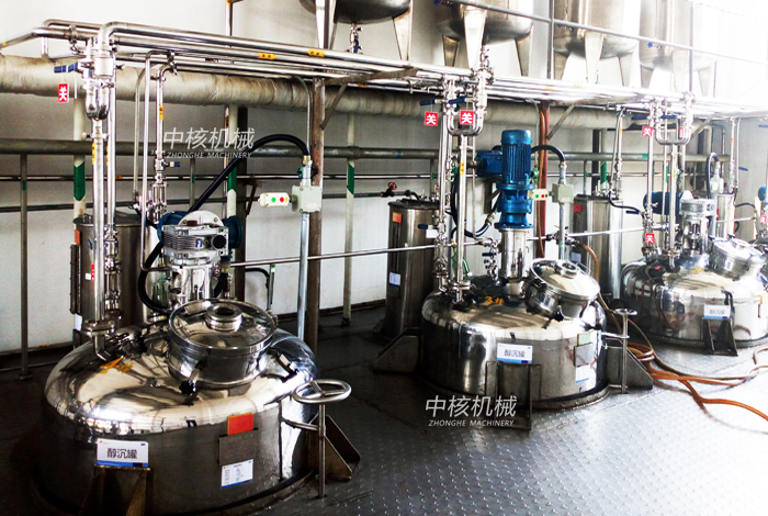中藥水煎濃縮液(一般比重為1.2左右),去除非醇溶性的淀粉、蛋白質等,采用加入酒精配成一定醇度的液體,然后常溫最好是低溫冷凍沉降進行固液分離以提高中藥提取液的純度及澄明度,從而提高產品質量。濃縮液和酒精按工藝要求,投入各自的配比量并開啟冷凍鹽水或冷卻水,攪拌混和均勻,達到料液所需的溫度后停止攪拌,繼續在夾套內通入冷凍鹽水或冷卻水,保證所需的液溫。待沉淀完成后開啟上清液出料閥放料。