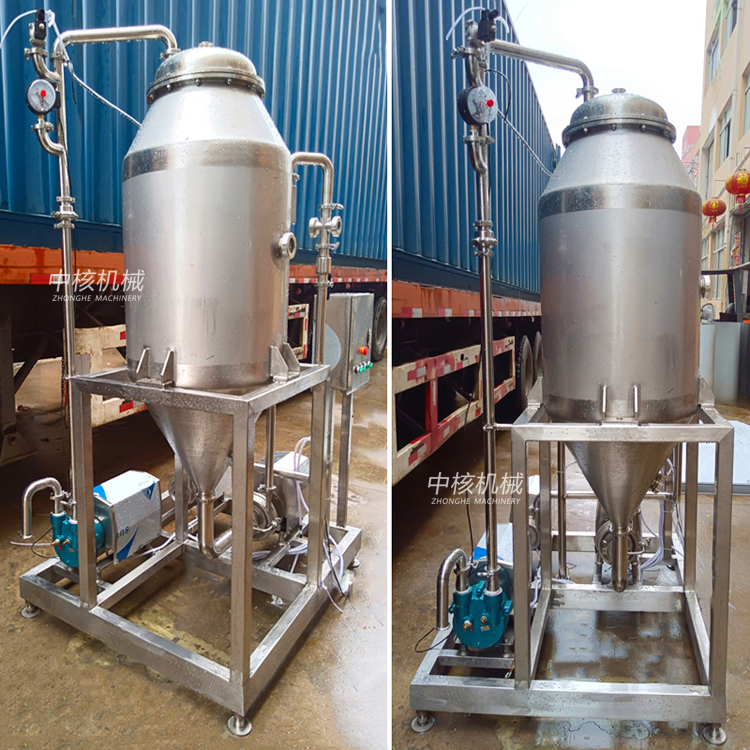 3、開啟視燈,開啟真空泵,待真空度到-0.07~-0.08Mpa左右時(shí),打開進(jìn)料閥,物料從進(jìn)料口自吸進(jìn)入罐內(nèi),當(dāng)物料升至一定位置時(shí)(在視鏡處可以觀看到),開啟出料泵出料。